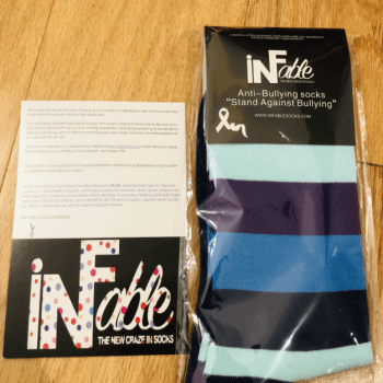 Being bullied myself at school I think having this pair of socks is a must! By buying these we help to fight bullies and harassers all over our country. Why buy ordinary socks if you can BOTH get comfortable, pretty, soft socks AND do your good deed for today?