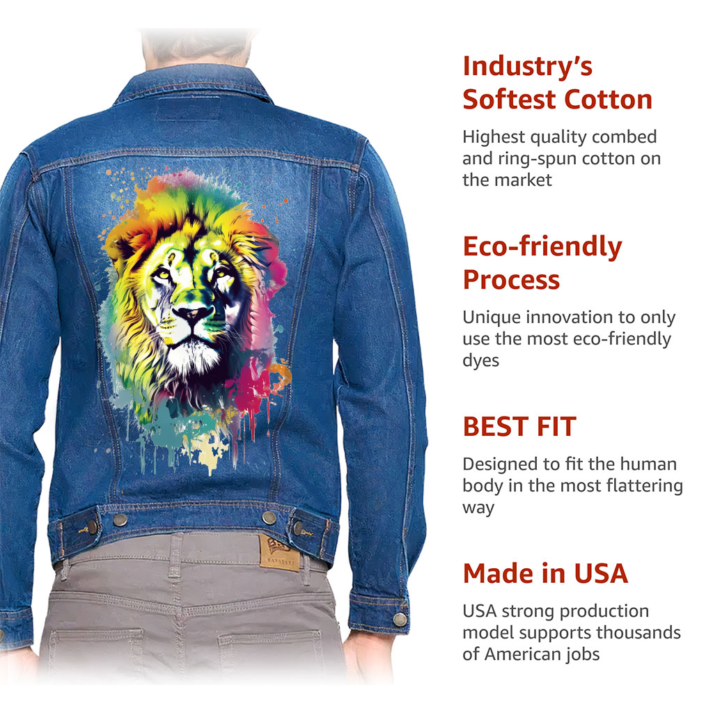 Colorful Lion Dark Washed Men’s Denim Jacket – Graffiti Denim Jacket – Art Print Jacket for Men