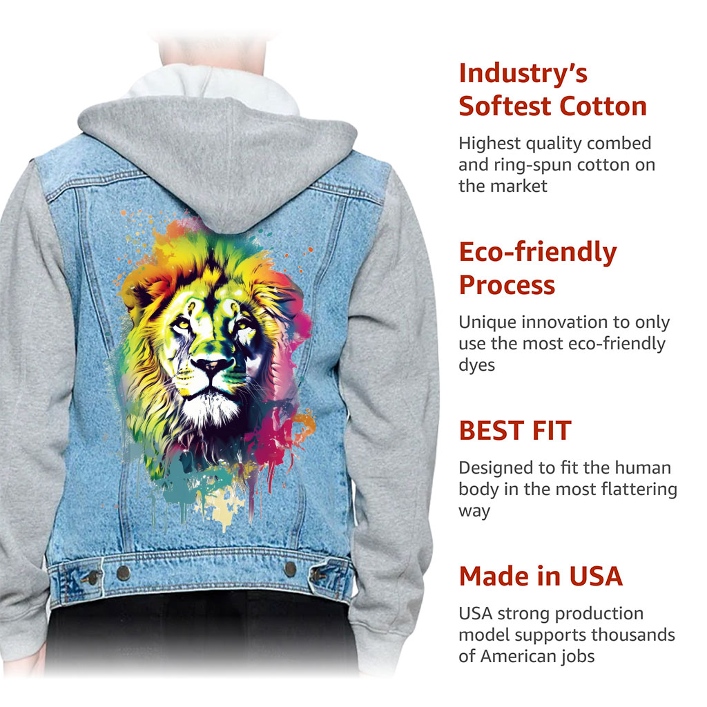 Colorful Lion Men’s Denim Jacket – Graffiti Jacket With Fleece Hoodie – Art Print Jacket for Men