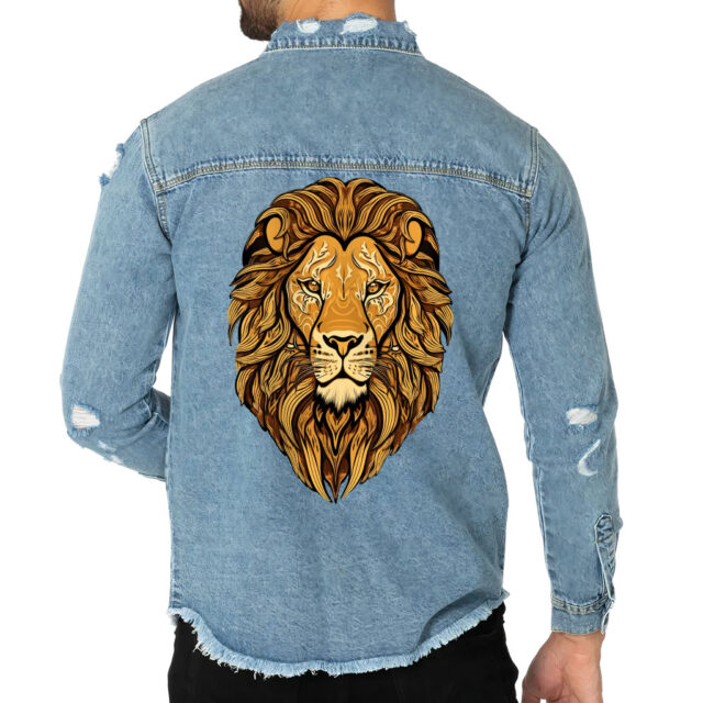 Colorful Lion Men’s Denim Shirt – Graffiti Denim Shirt – Art Print Long Sleeve Shirt