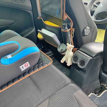 This is what you need when you transport kids in the back! Attaches to the top of the headrest, around the back of the seat and below. High-quality organizer. Lots of pockets and two carabiner hooks to which you can attach a toy or a child's backpack. Also protects against dirty shoes