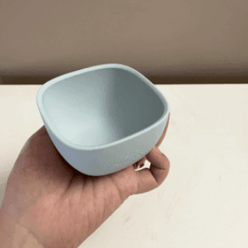This is the cutest baby bowl we’ve ever had. As you can see it fits right in my hand and is a perfect size for the little one to start trying solid food. It is well made of high quality silicone and has no smell at all when we get it out of the package. The silicone is thick, very sturdy, and super easy to clean. We got the light grey color and have been using this to feed baby with yogurt or blueberries for over two months and it still looks clean as a new one.