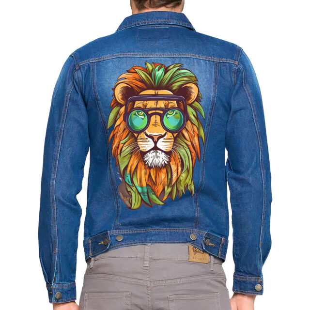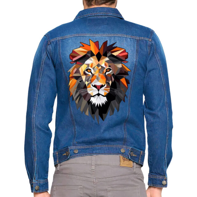 Lion Face Light Washed Men’s Denim Jacket – Geometric Denim Jacket – Cool Graphic Jacket for Men