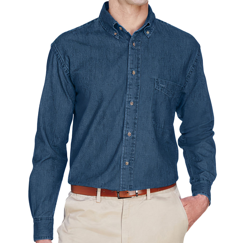 Classic casual button down shirt for men with comfortable jeans fabric, featuring a turn down collar neck, button up closure, single chest pocket, loose fitting and plain color.