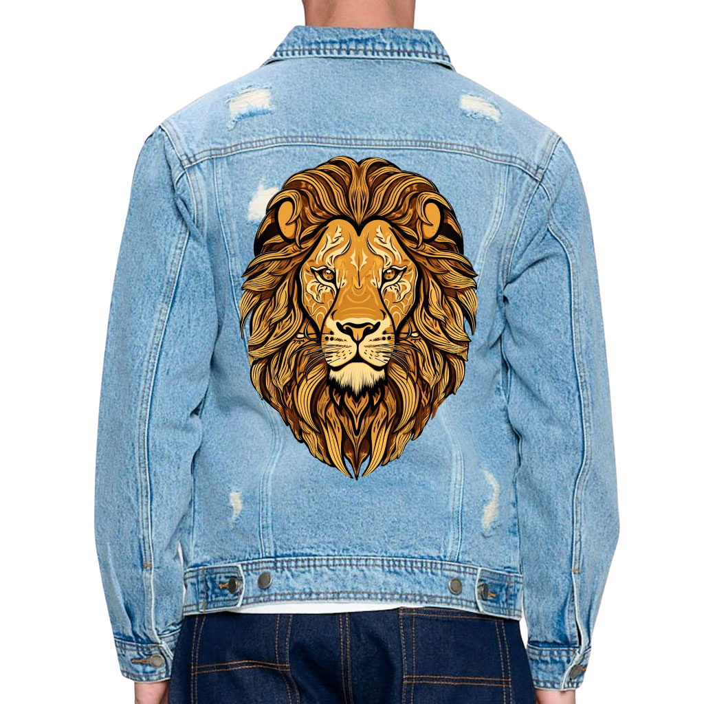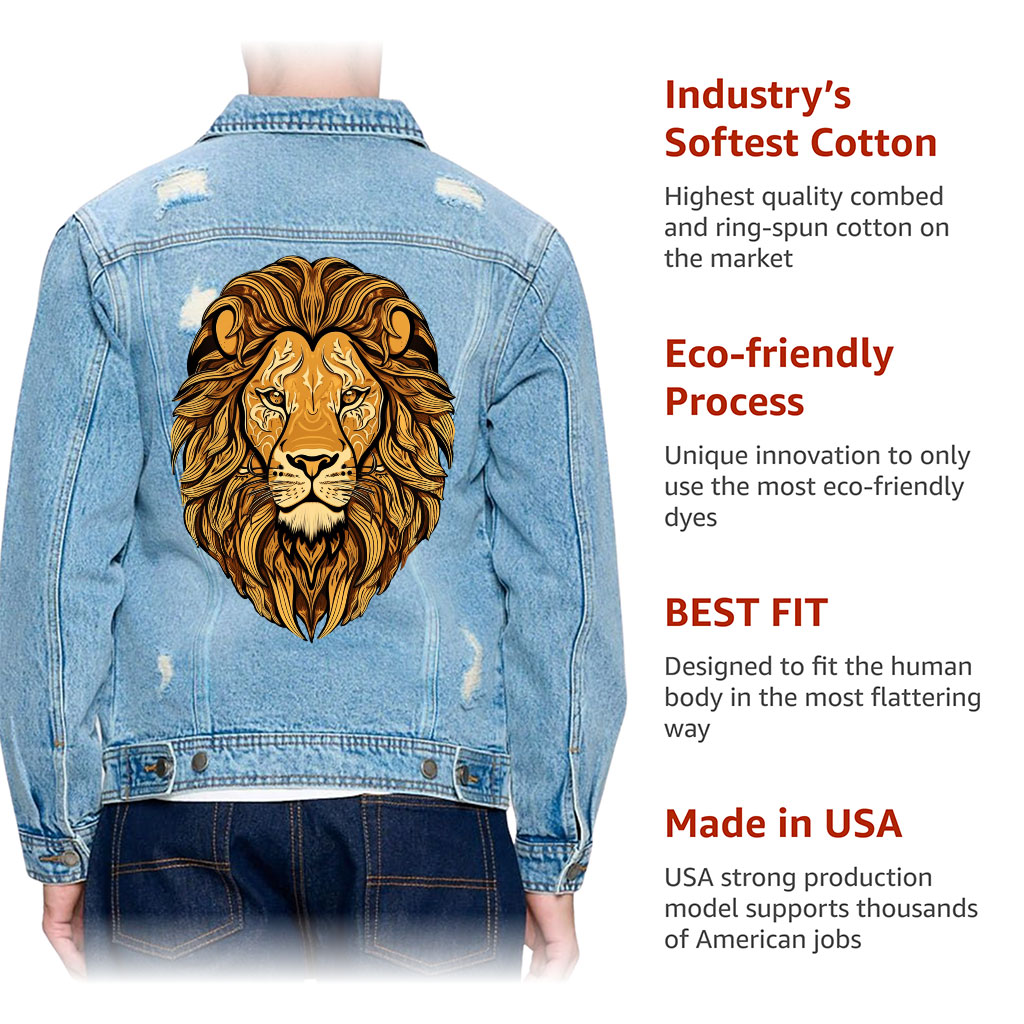 Lion Face Print Men’s Distressed Denim Jacket – Unique Design Denim Jacket for Men – Graphic Art Denim Jacket