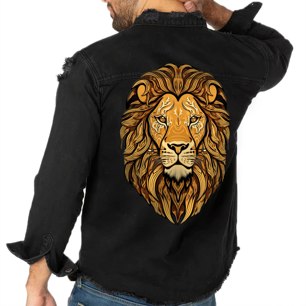 Lion Face Print Men’s Vintage Denim Shirt Distressed