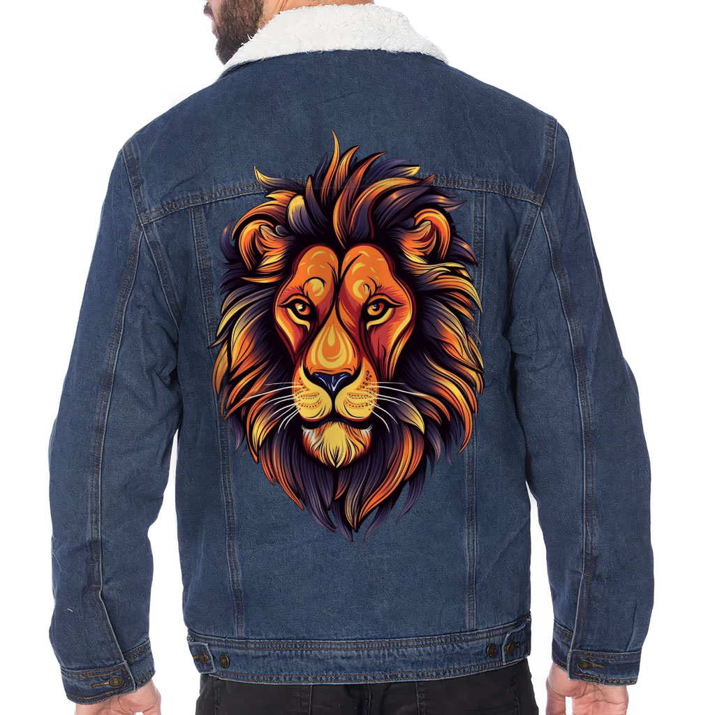 Lion Men’s Sherpa-Lined Denim Jacket – Animal Design Denim Jacket – Graphic Jacket for Men