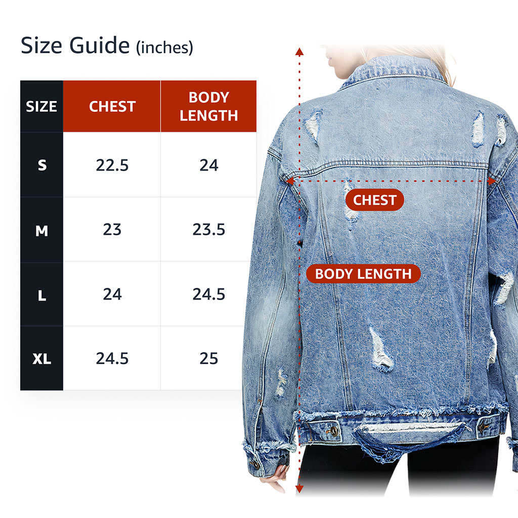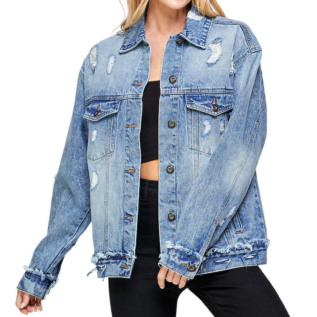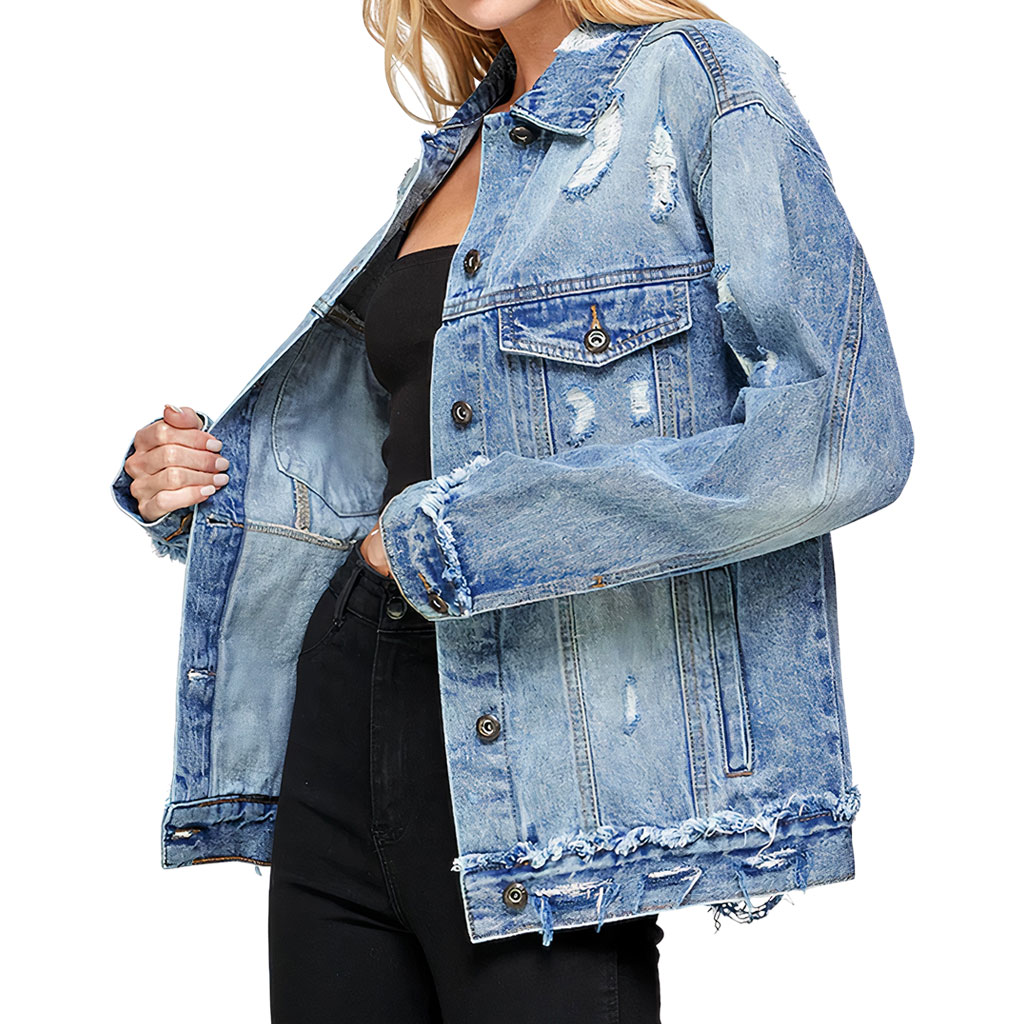 Summertime Ladies Denim Jacket is light enough to wear on a cool day but roomy enough to layer it with a sweatshirt. The ripped distressed frayed denim jacket is a basic to add to your fall wardrobe.