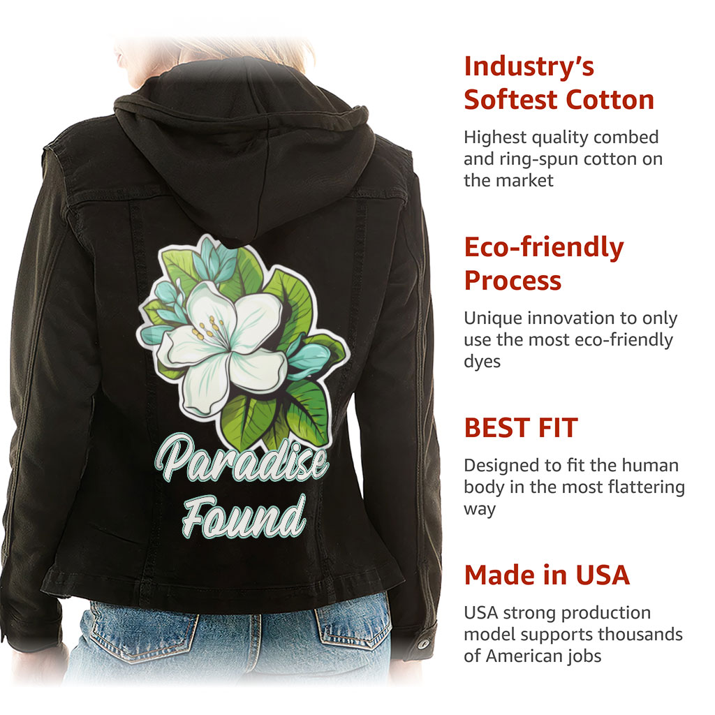 Paradise Ladies’ Denim Jacket with Fleece Hoodie – Floral Women’s Denim Jacket – Graphic Denim Jacket