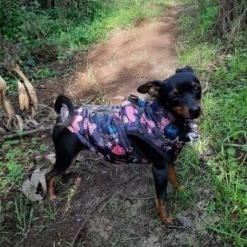 Fergus, our Jack Russell, adores his camo rain jacket.