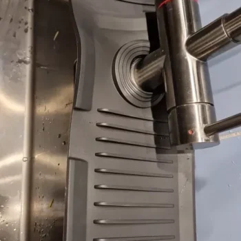 Recently, I decided to give this mat a try and wow, what a difference it has made! The water that used to pool and create a mess is now neatly contained. I appreciate the thoughtful design, especially the raised edges that keep everything in place. It's not only practical but also has a sleek look that blends nicely with my kitchen decor. Cleaning is a breeze, and I find myself less stressed about the post-dishwashing water mess.