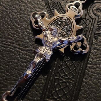 A Token of Spiritual Warfare: While Catholics do not perform exorcisms, the Saint Benedict Medal, combined with holy water, the crucifix, and other sacramentals, serves as a formidable tool against negative influences. This medal, set within a Celtic cross, is widely considered an influential shield against harmful entities.