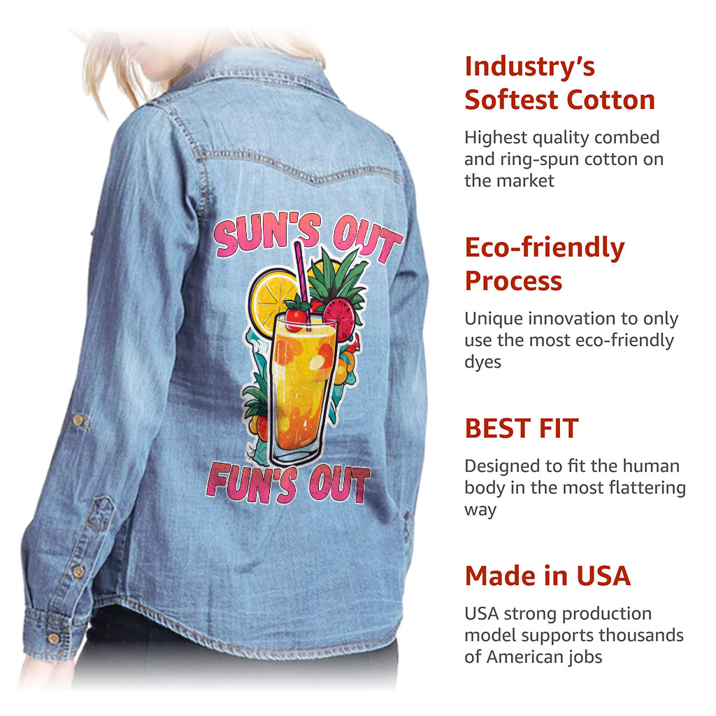 Sun’s Out Women’s Long Sleeve Denim Shirt – Cocktail Ladies Denim Shirt – Themed Denim Shirt