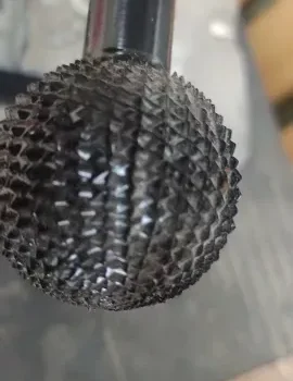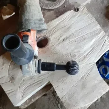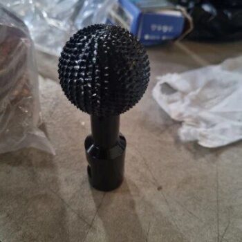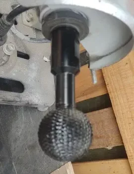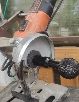 This heavy and sharp tool processes trees quickly, but it has a drawback: a strong deviation of 7mm from the axis. It's unusable on a small grinder without rpm adjustment but works well on a larger grinder set to a minimum speed.